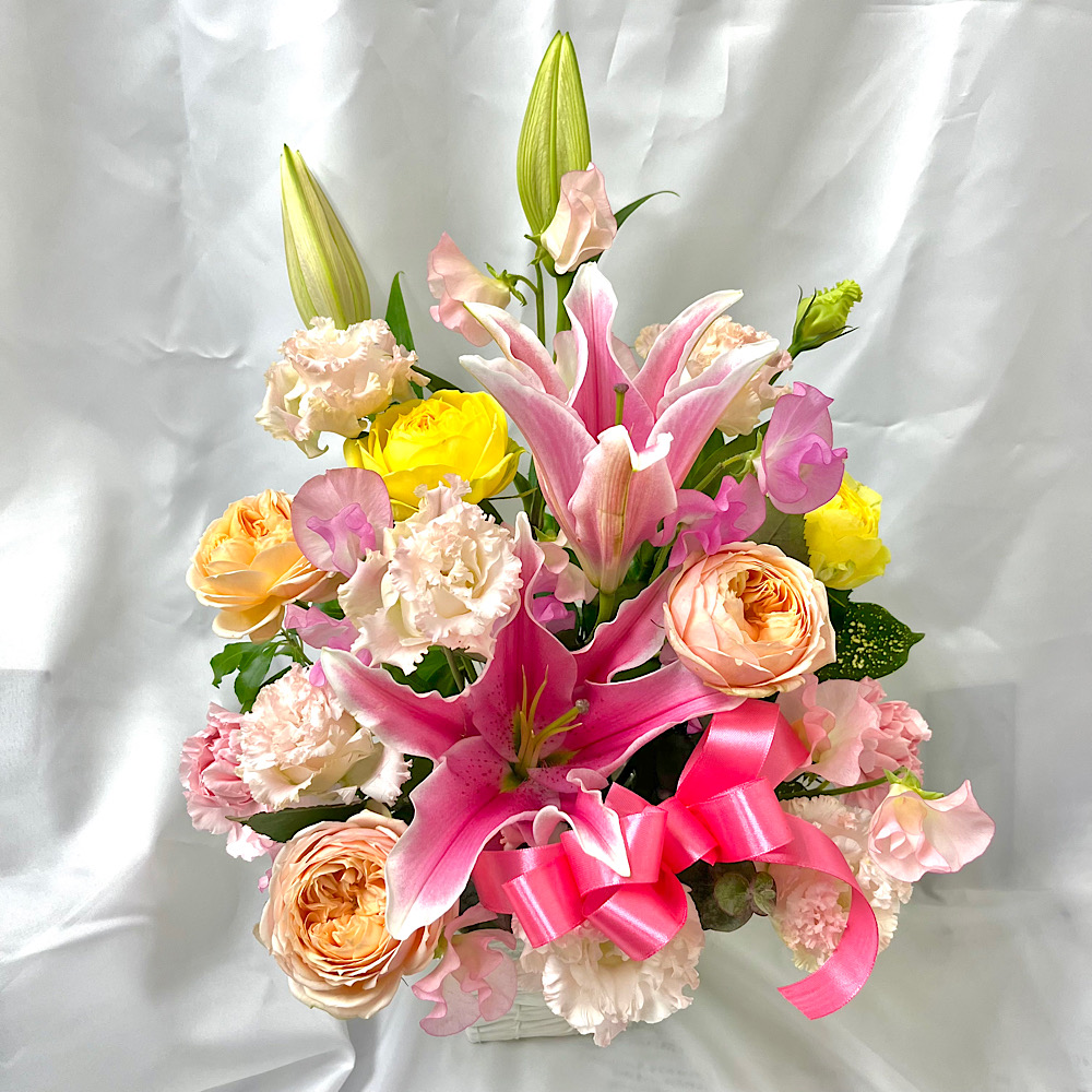 ピンク色をメインに黄色やオレンジの暖色で春らしさを演出したアレンジメント. ピンク色の濃淡が奥ゆかしさを感じられます.お祝いギフトや卒業・退職のプレゼントにもご利用いただけます.