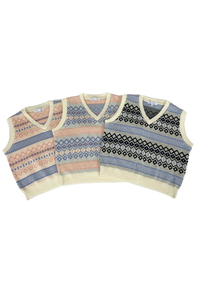 子供服!ジャガード編のベストはTシャツやブラウスと重ねてインパクトのある着こなしに。兄弟でおそろいコーデが可能です。 製造元:米沢ニット㈱