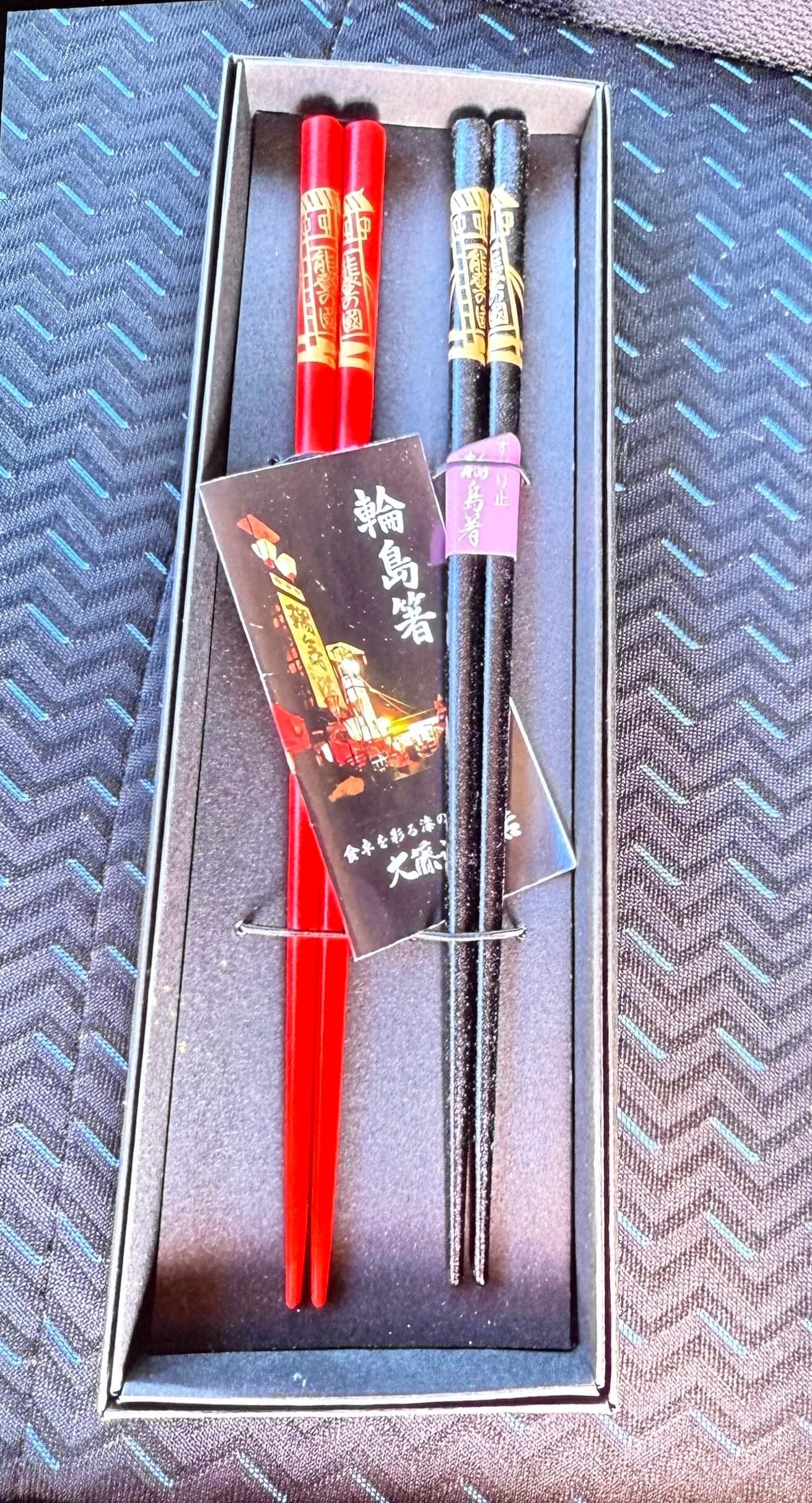 <p>金、銀の柄の輪島塗り箸二膳を桐箱に収めて進呈させていただきます。<br>