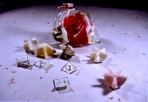 餅生地せんべいを花型につまみ初笑いを誘うことわざや洒落を書いた紙を入れてあります。