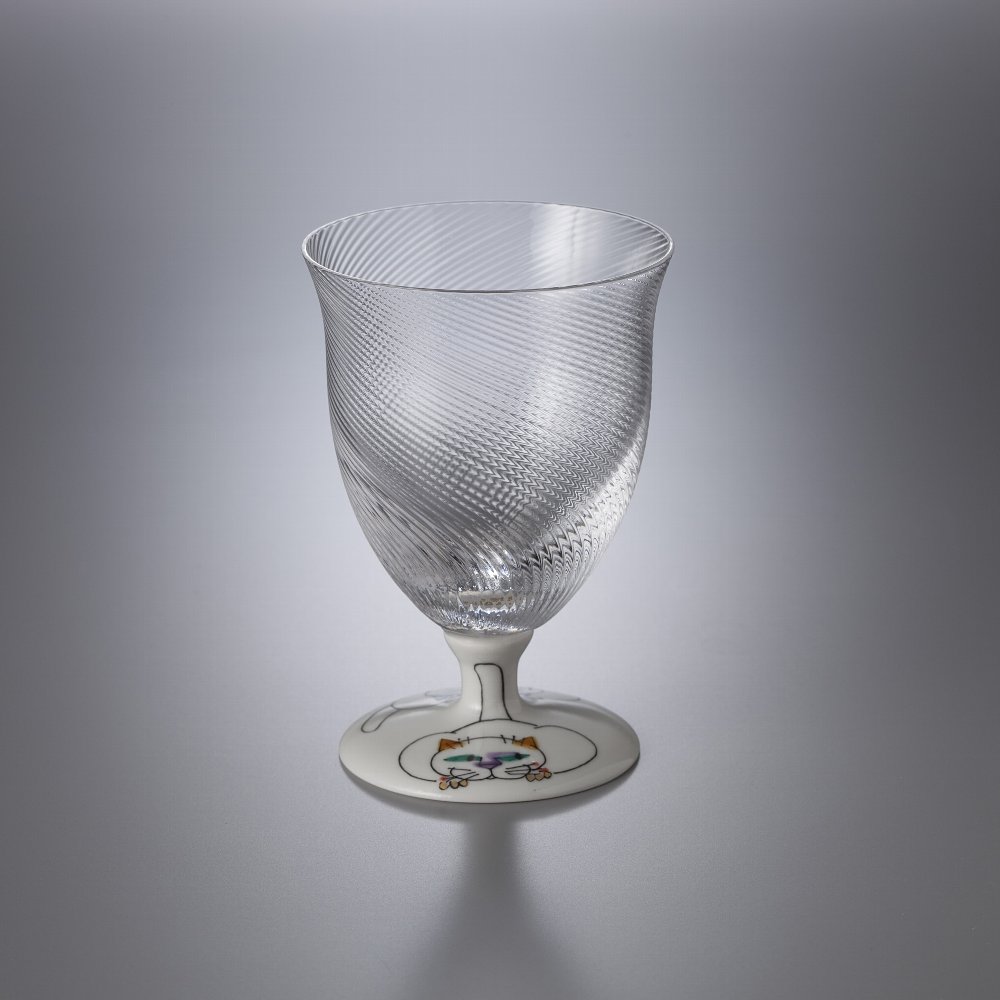 九谷焼磁器と手作りの吹き硝子(江戸硝子)を独自の技術により融合させた九谷和グラスシリーズのフリーグラス。 2006年度グッドデザイン賞(新領域デザイン部門)受賞商品です。 九谷焼で出来た脚部分もガラスもすべて手作りで、国内生産にこだわり作製しております。 太々しいネコの表情が可愛いデザインです。 素材:磁器(九谷焼)・バリウムクリスタル(江戸硝子) サイズ:約φ75mm×高さ108mm・満水時容量約180ml