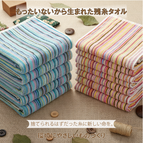 このタオルは、製造工程で「本来なら捨てられてしまうはずだった残りの糸(残糸)」を再利用して作られています。