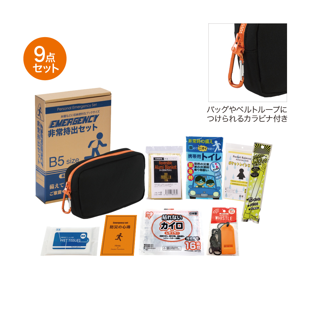 収納しやすいB5サイズ化粧箱入防災セット。 防災士が選ぶコンパクトセット 〈セット内容〉 収納ポーチ・防災の心得・ホイッスル・カイロ・レインコート・携帯用トイレ・発光スティック・アルミブランケット・除菌アルコールウェットティ ※一部、色・柄・内容が変更になる場合がございます。