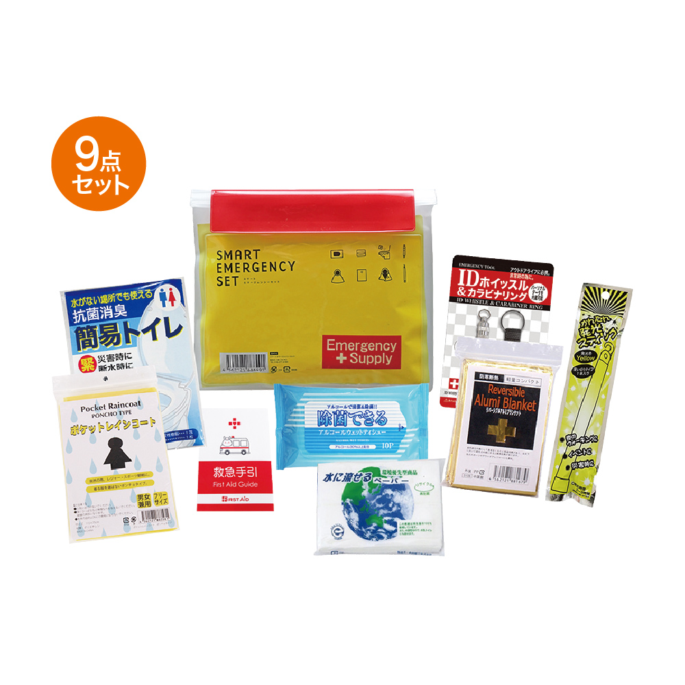 防水ポーチ・IDホイッスル&カラビナリング・レインコート・救急手引・除菌アルコールウェットティッシュ・水に流せるペーパー・発光スティック・抗菌消臭簡易トイレ・アルミブランケット