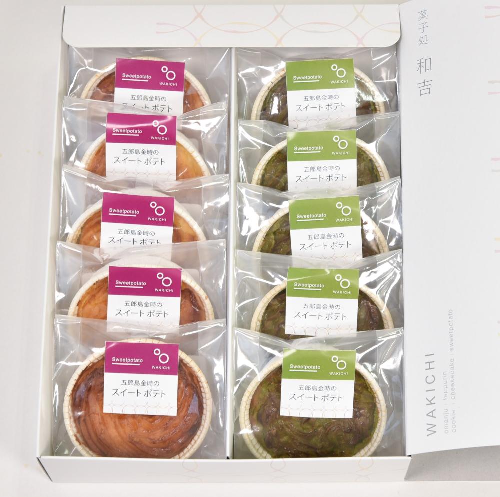 当店の焼き菓子人気№1の五郎島金時に抹茶が仲間入り。プレーン5個と抹茶5個の詰合せです。和吉のオリジナルギフト箱にてお届けいたします。