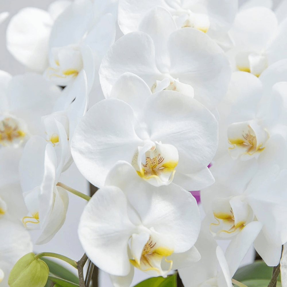 中輪の白花が愛らしいタイプのコンパクトな胡蝶蘭です。リップの差し色も控えめなので、ちょっとした贈り物としても人気があるタイプです。