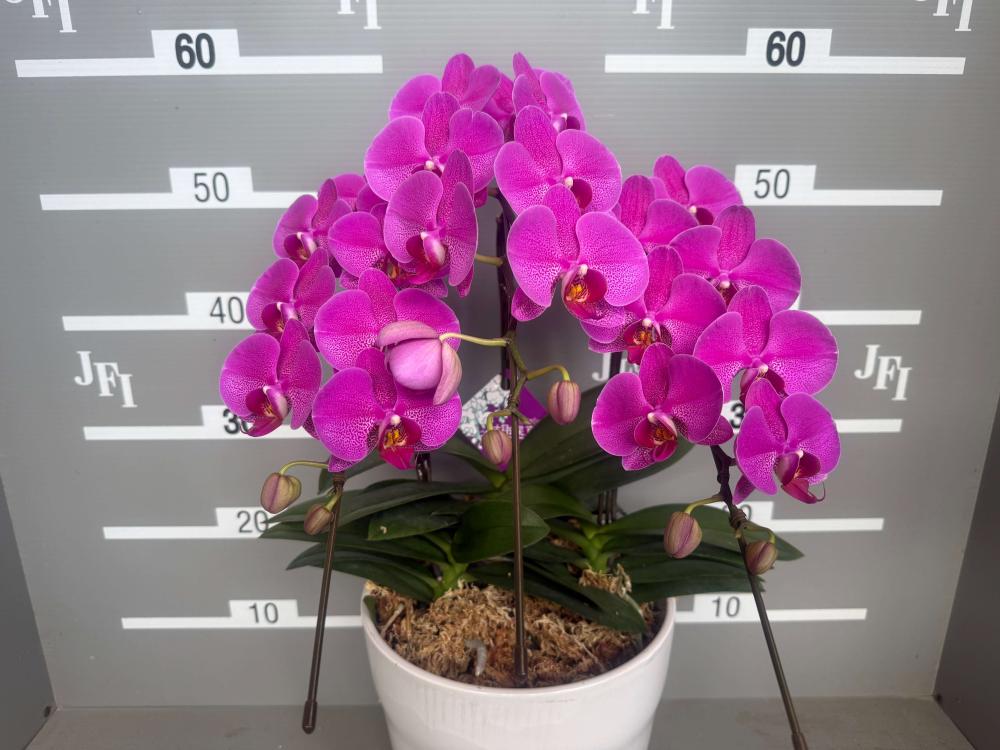 華やかな濃いピンクでゴージャスさはそのままに、全体の大きさをコンパクトにした中輪の胡蝶蘭です。