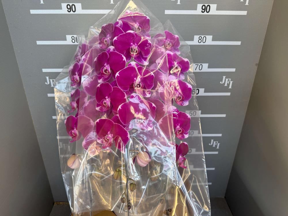 華やかな紫色で珍しい色の中輪の胡蝶蘭です。